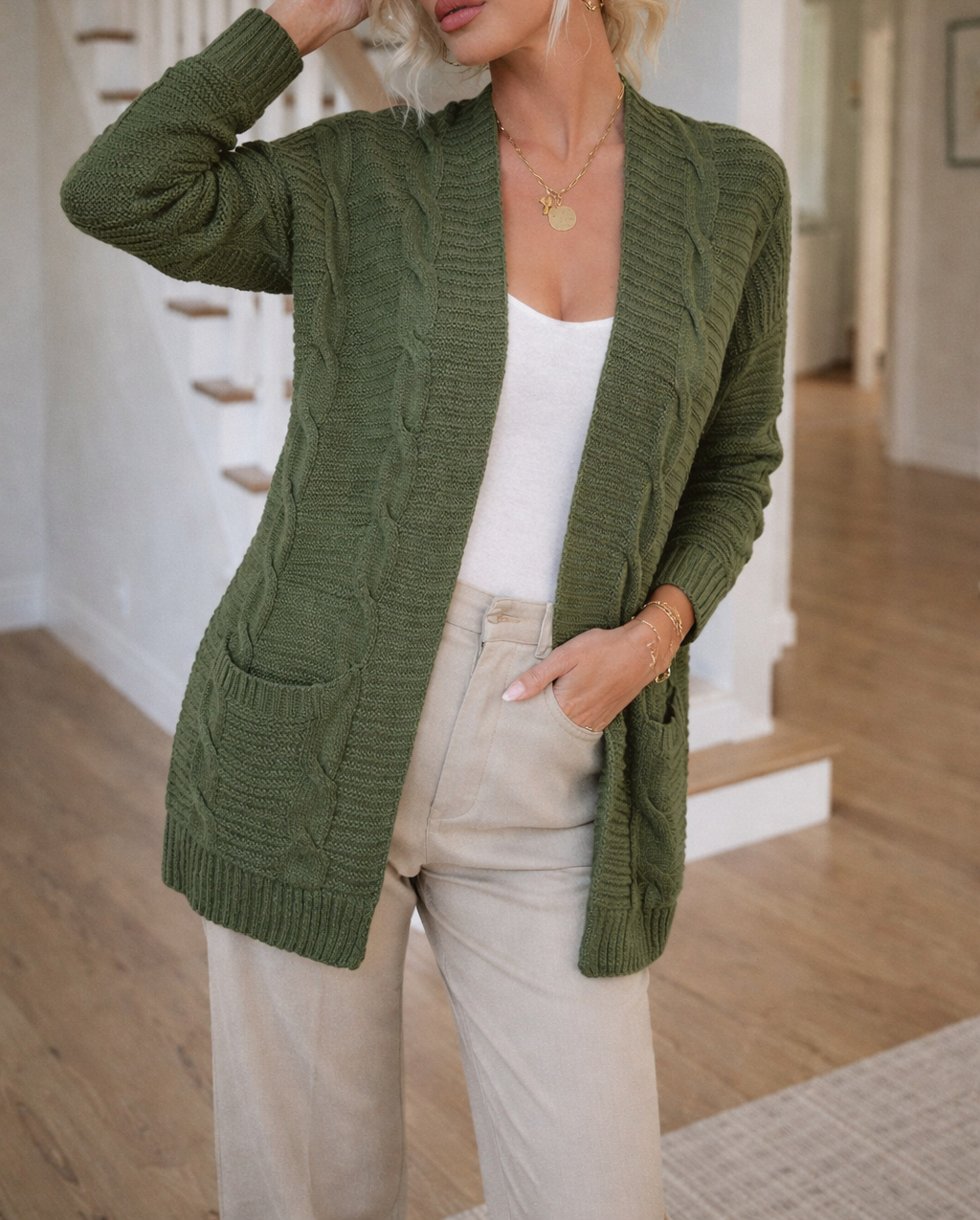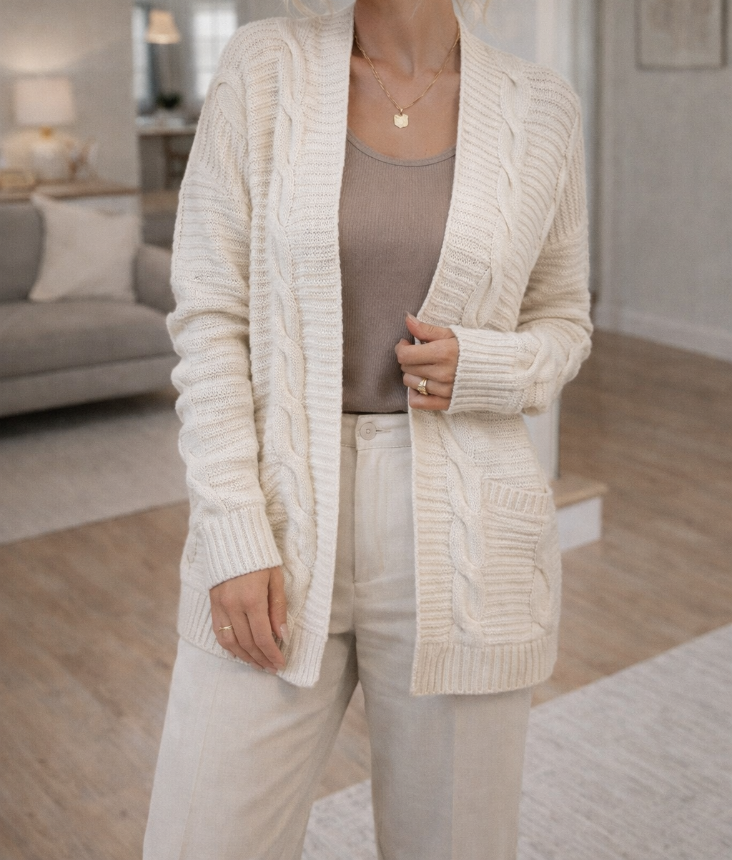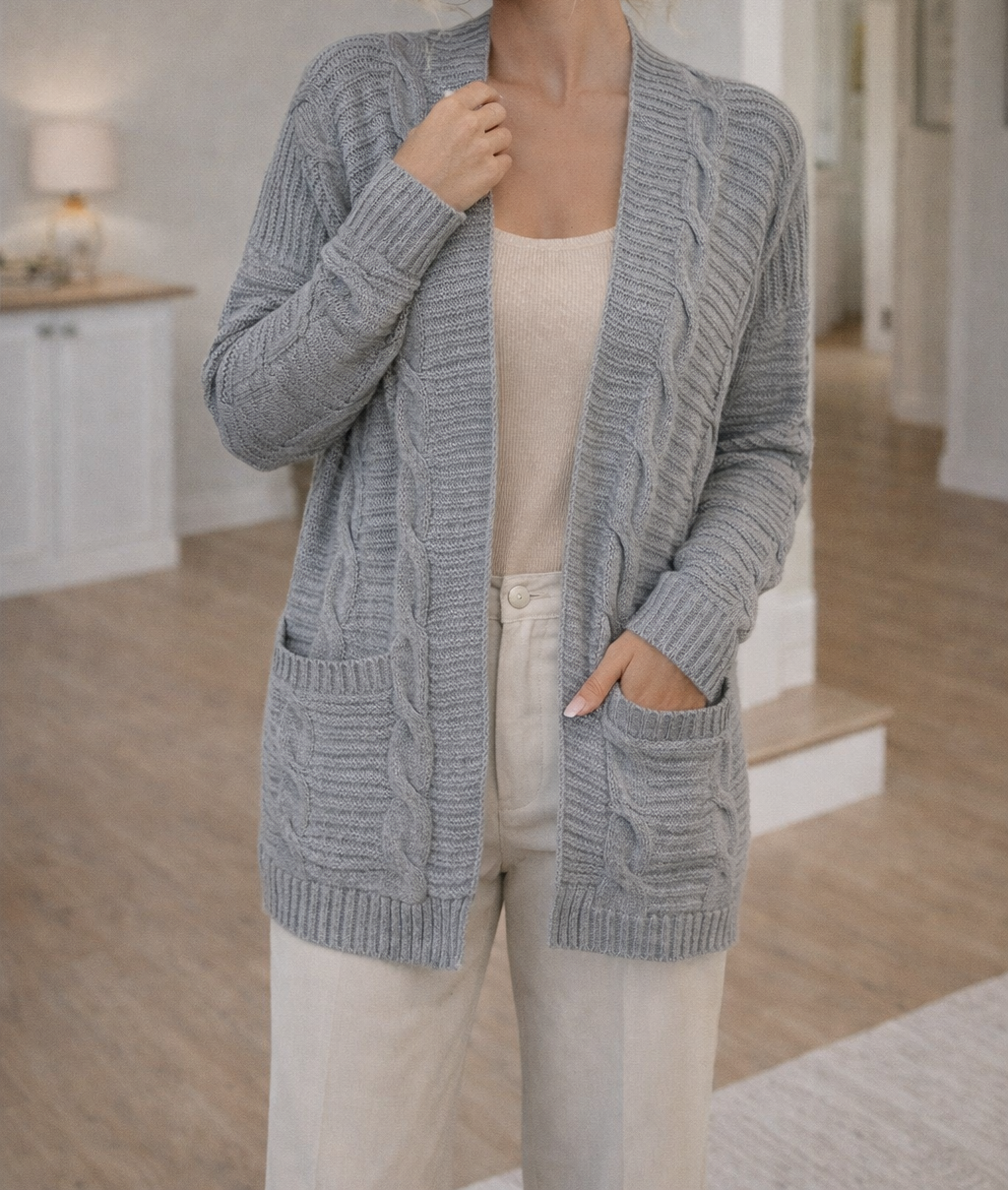 This women's cardigan is a knitted open model that offers a comfortable and relaxed style. With long sleeves and practical pockets, it is perfect for chilly days. The cardigan is easy to style and is great for layering.
