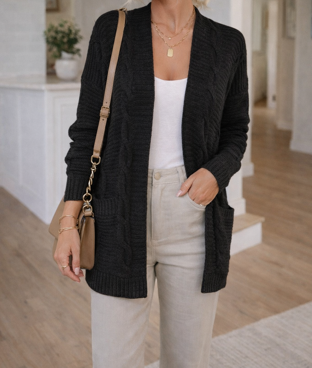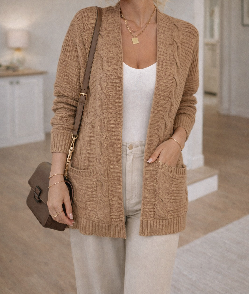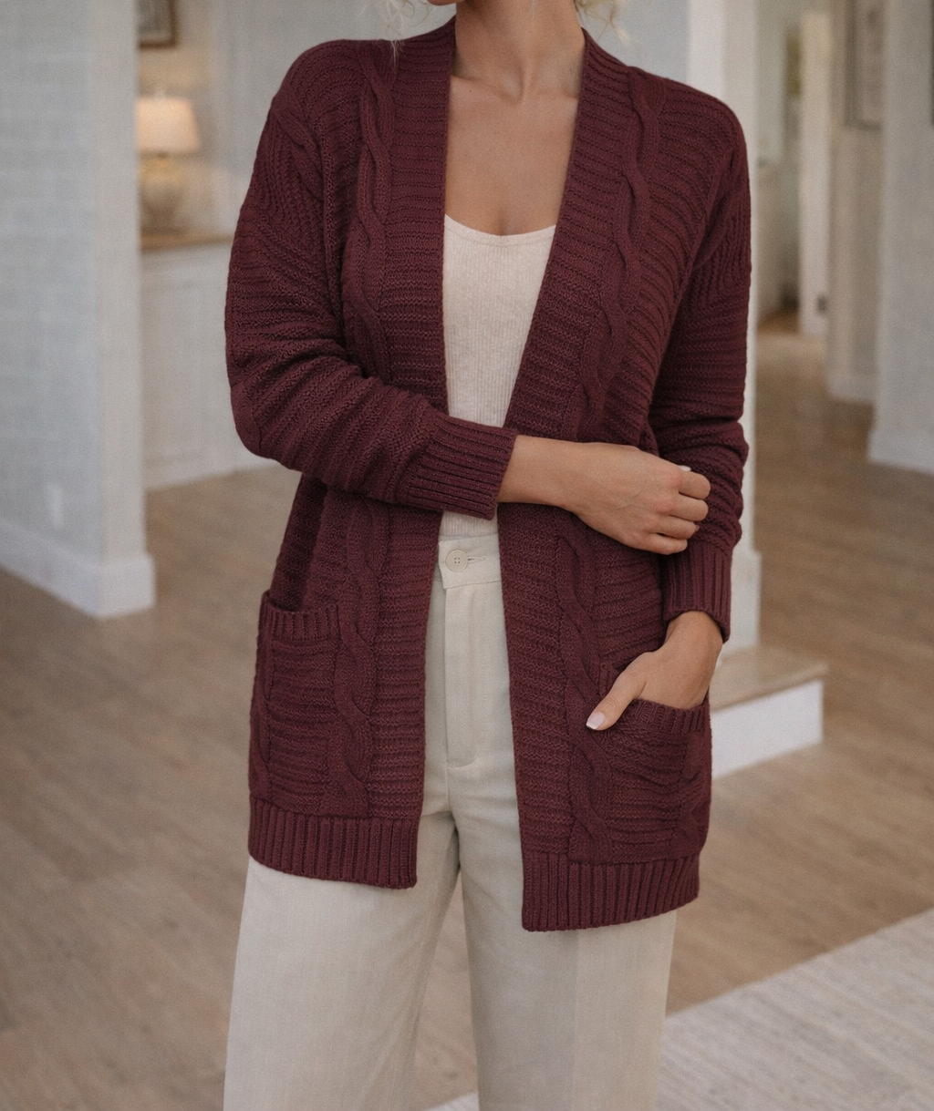 This women's cardigan is a knitted open model that offers a comfortable and relaxed style. With long sleeves and practical pockets, it is perfect for chilly days. The cardigan is easy to style and is great for layering.
