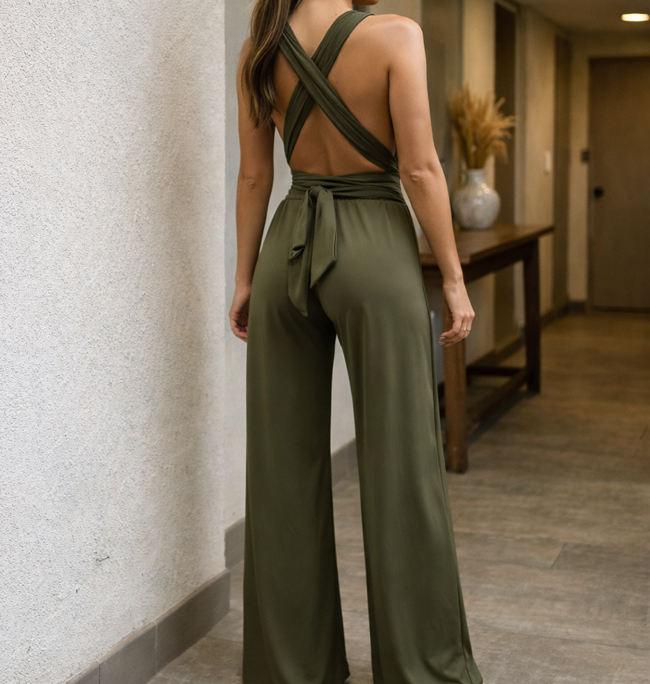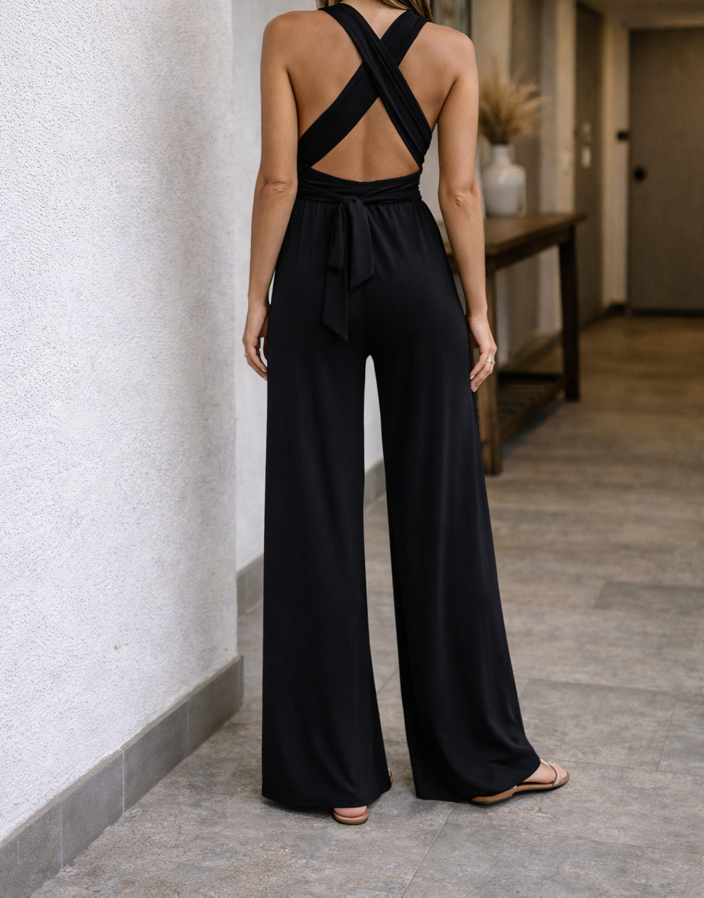 This women's jumpsuit features a sleeveless design with a V-neck and wide legs, creating an elegant and flattering silhouette. The adjustable waist belt allows you to customize the fit as needed. The jumpsuit is perfect for both everyday and party wear, making it a versatile piece in your wardrobe.