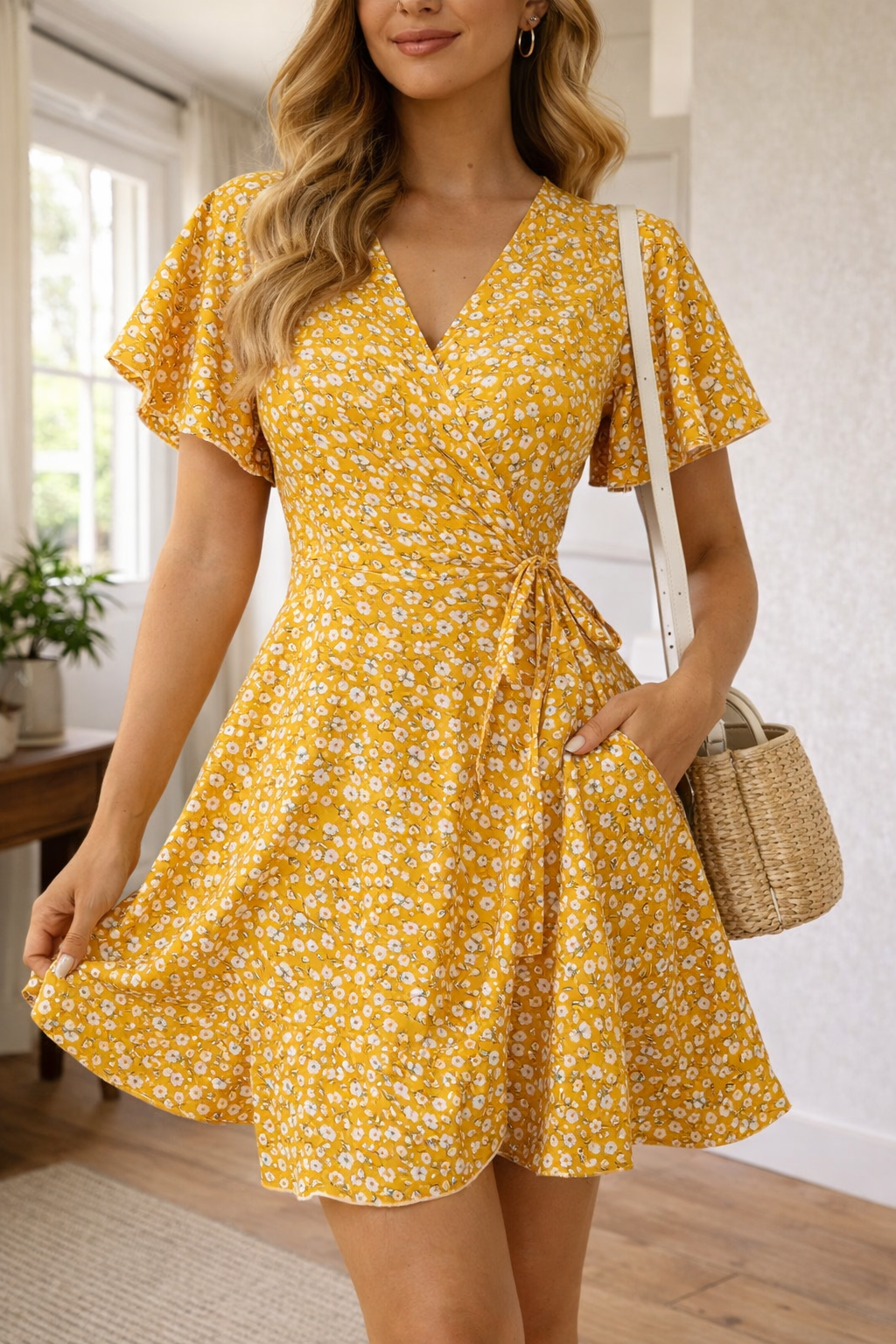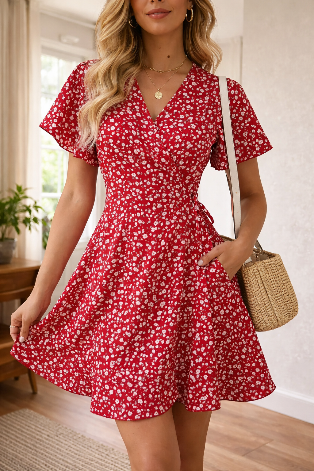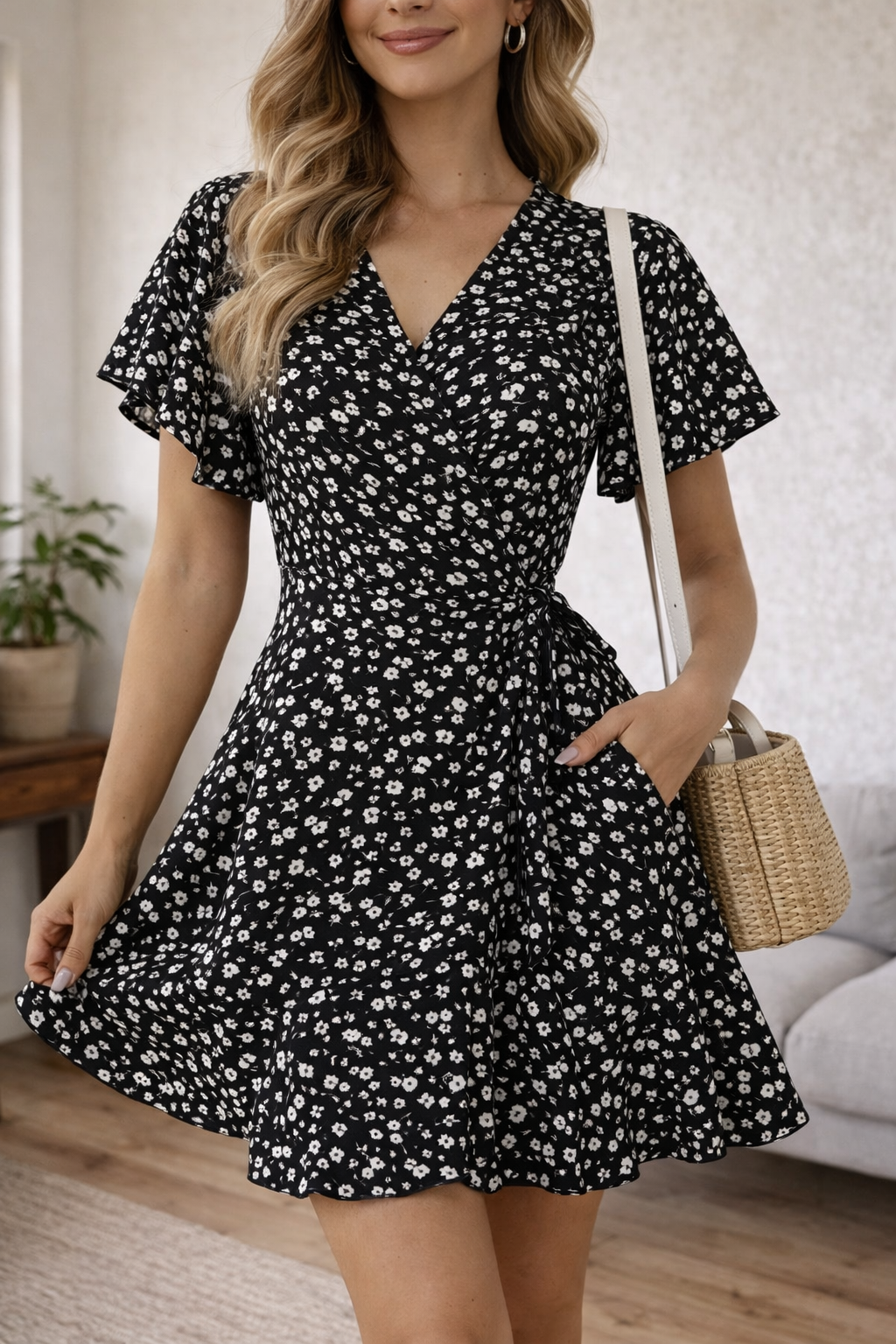 This women's wrap dress offers an elegant and relaxed style. The dress has a flattering V-neckline and short ruffle sleeves that give an airy feel. The floral pattern contributes to a fresh and summery look, making it perfect for both everyday and party wear.