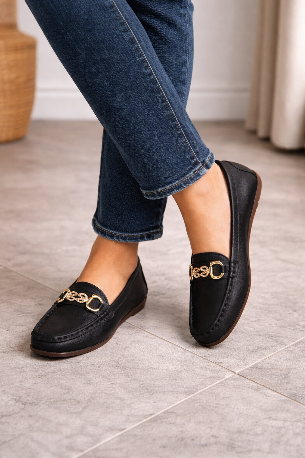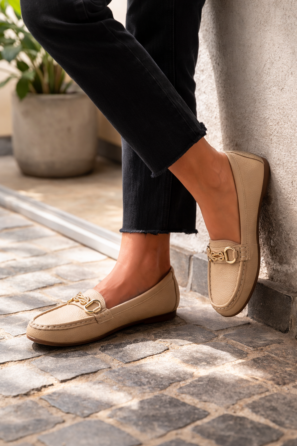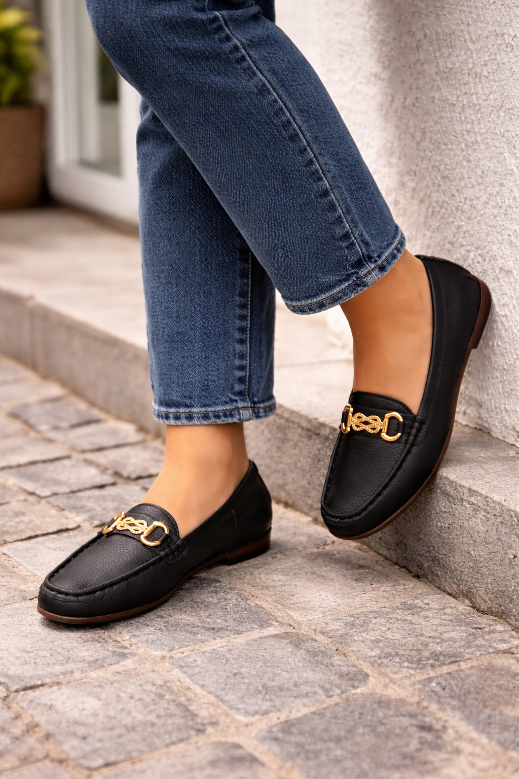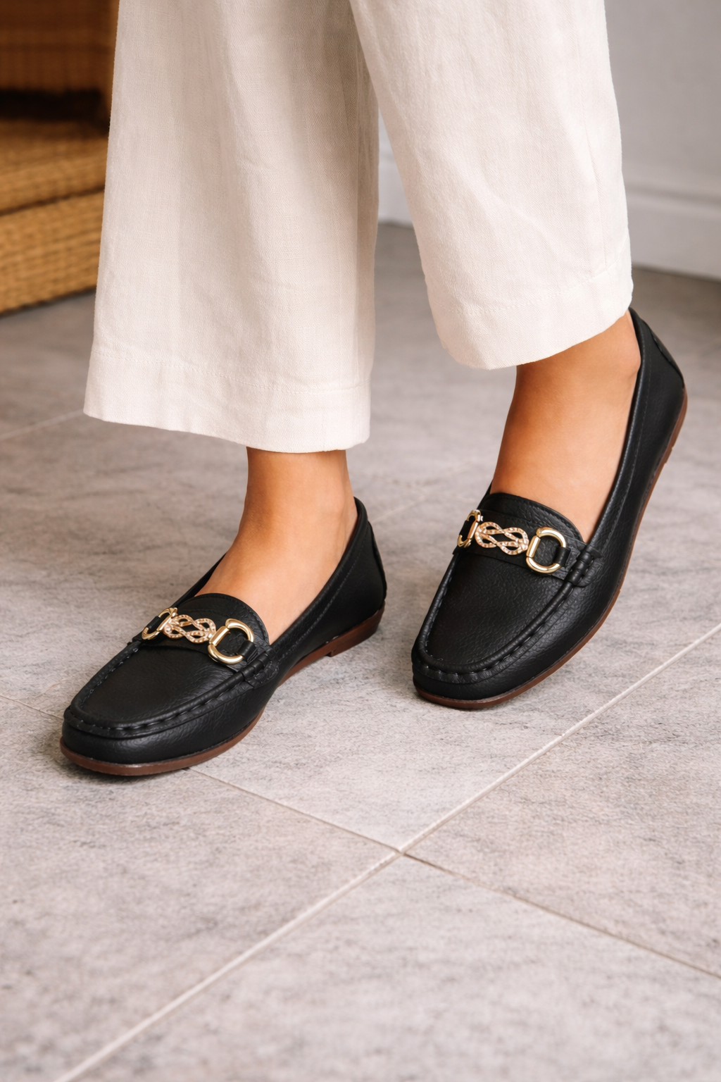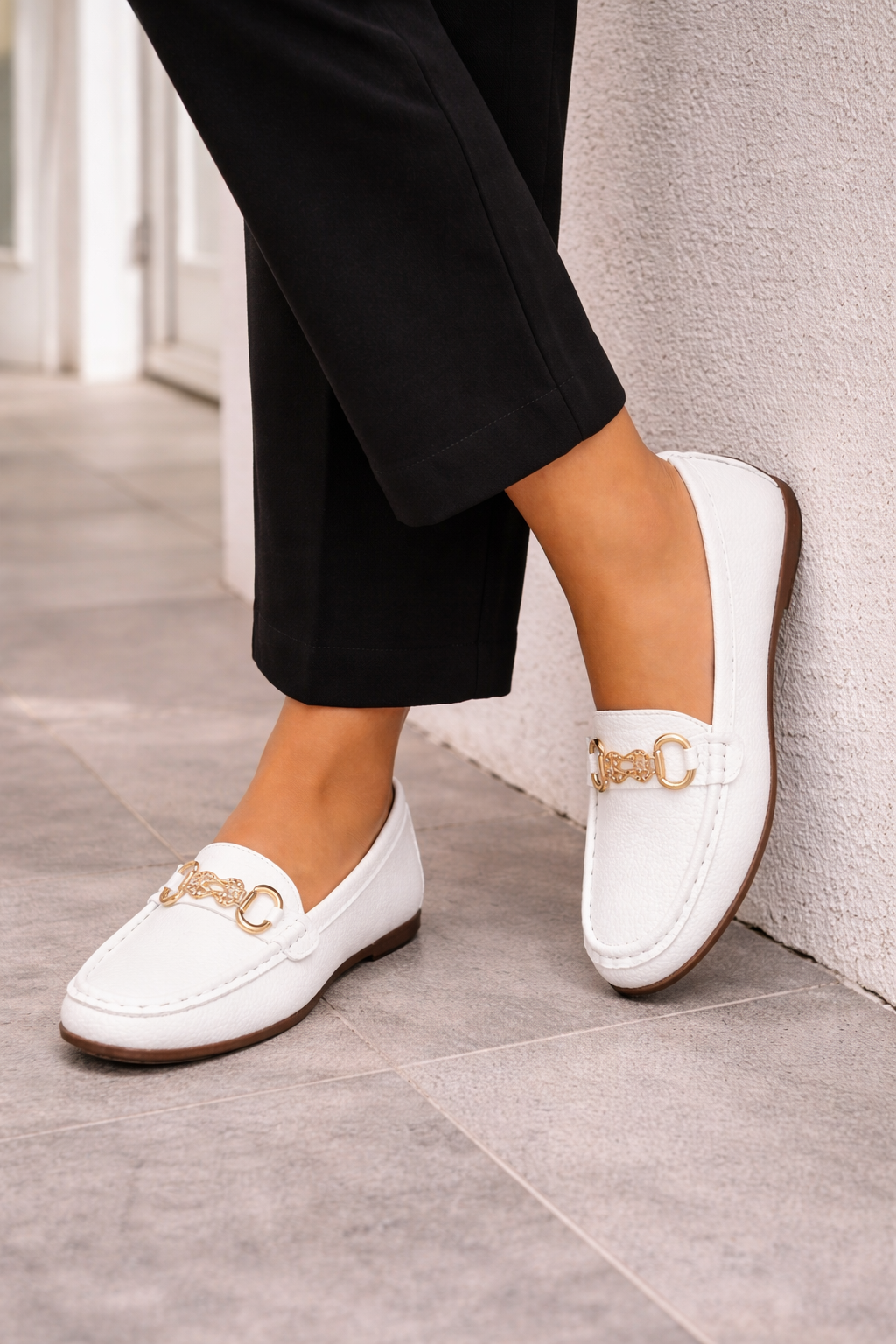 Women's loafers are designed to combine style and comfort. These loafers feature a classic round toe and a decorative chain detail that adds an elegant touch. The smooth slip-on design makes them easy to put on and take off, making them perfect for both casual and more formal wear.