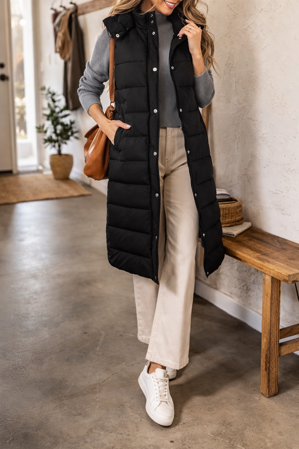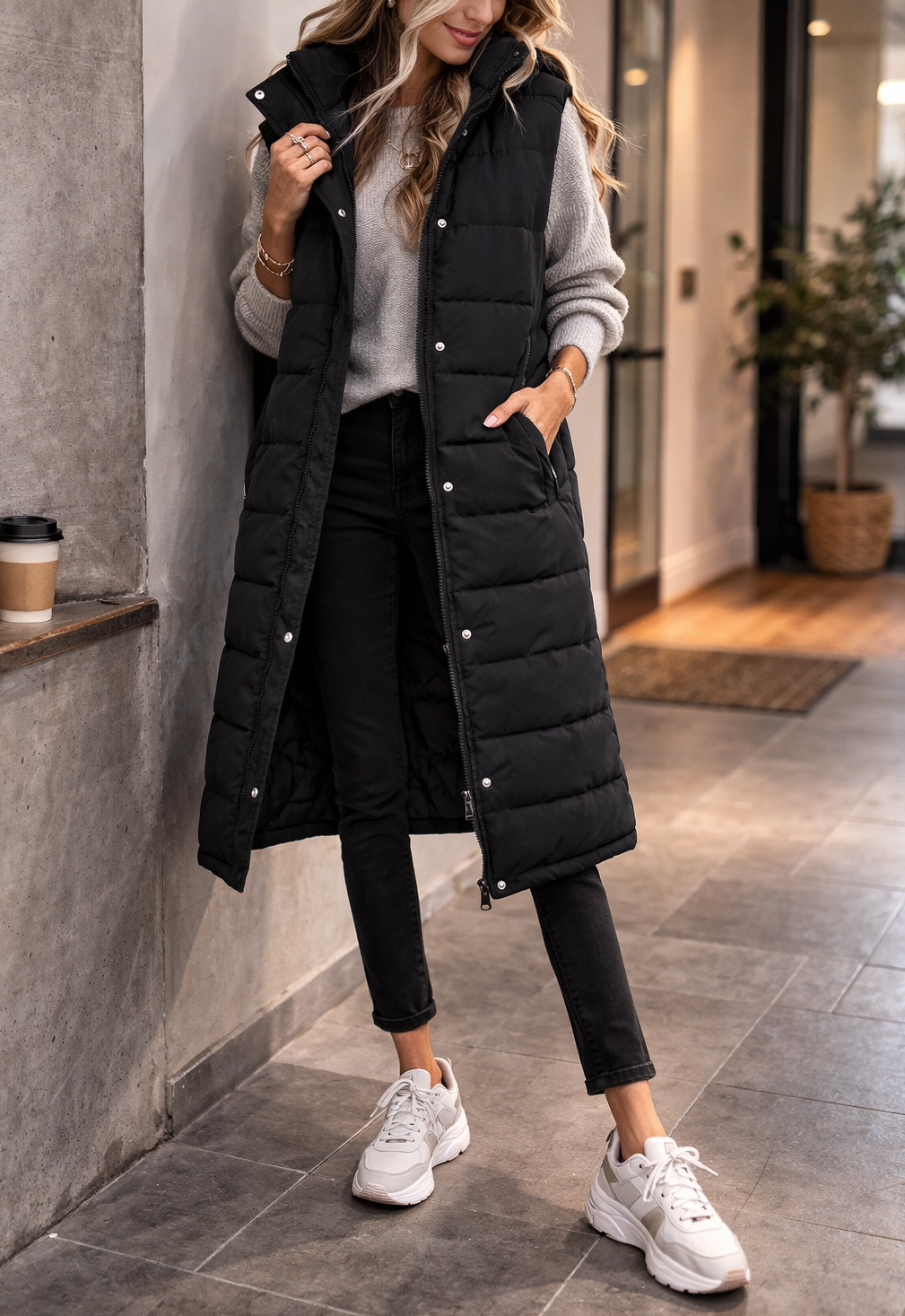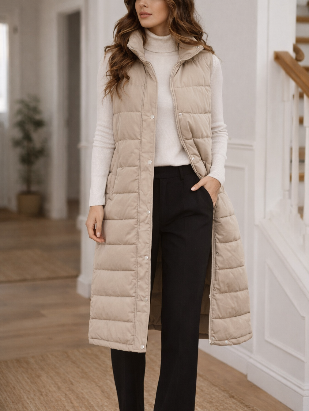 This long padded vest is perfect for keeping you warm on chilly days. With a high collar and practical button closure, it offers both comfort and style. The sleeveless design makes it ideal for layering, making it a great choice for everyday wear.