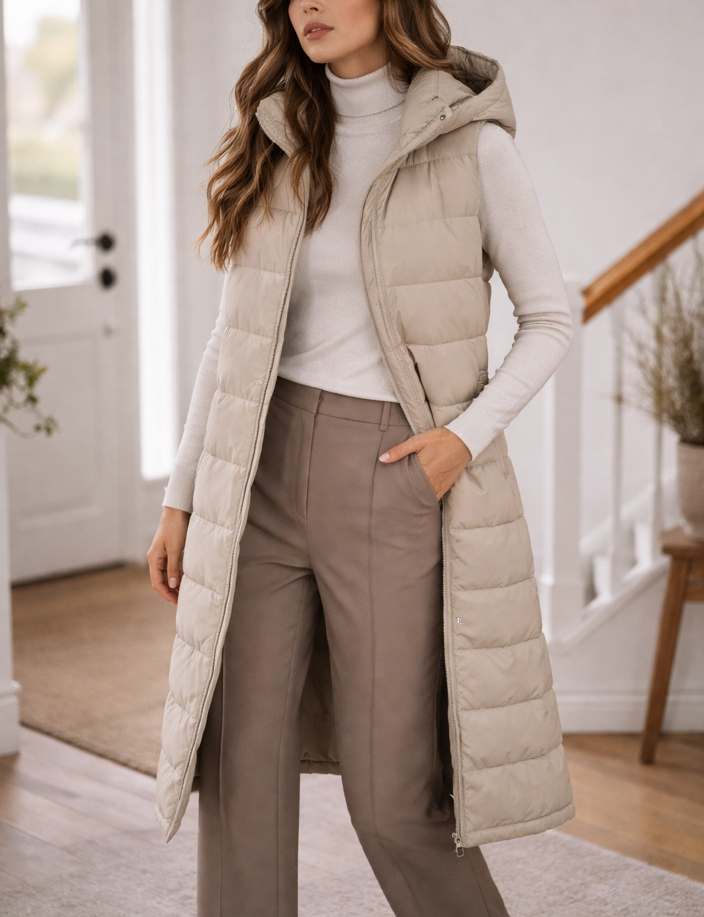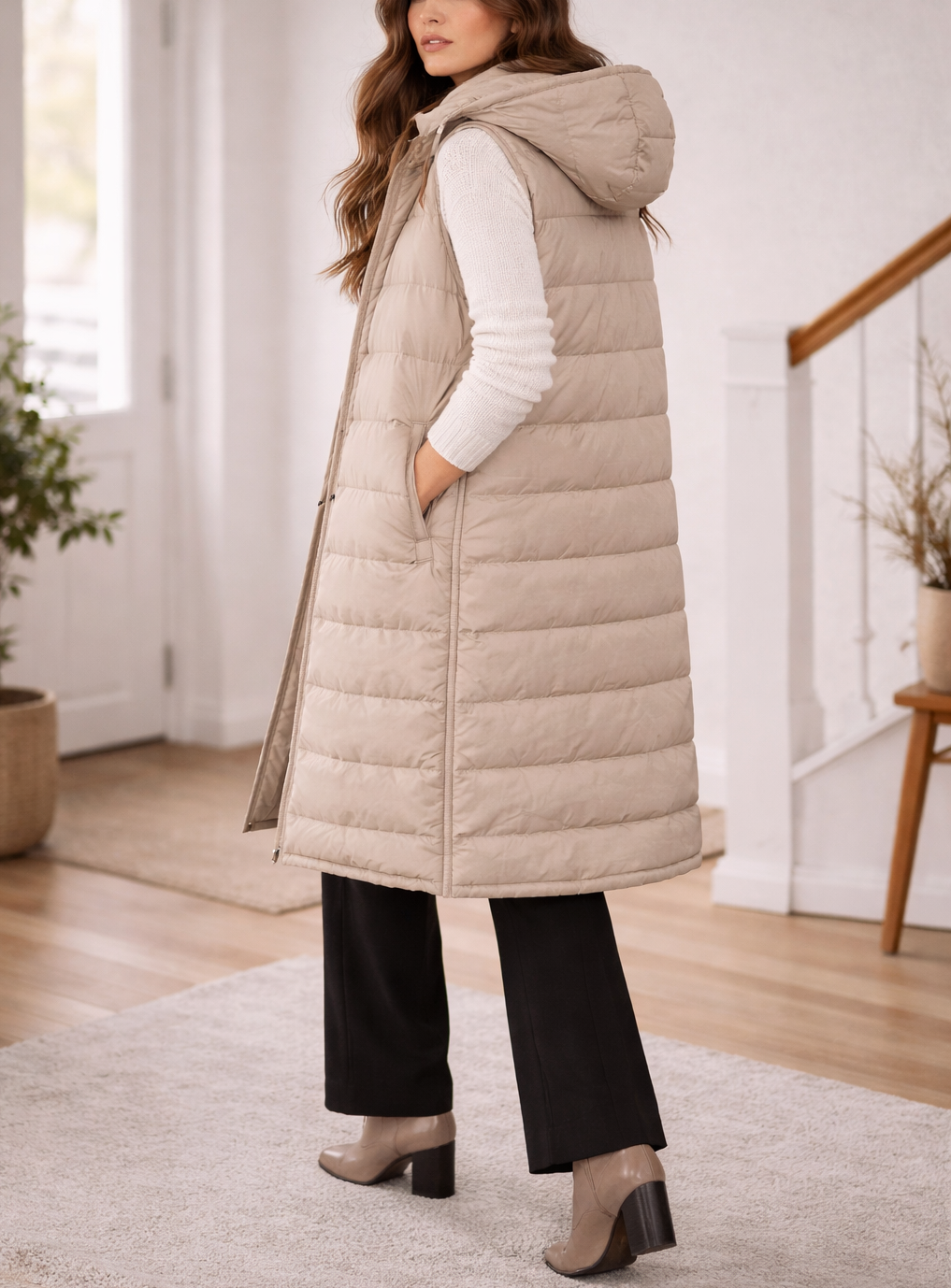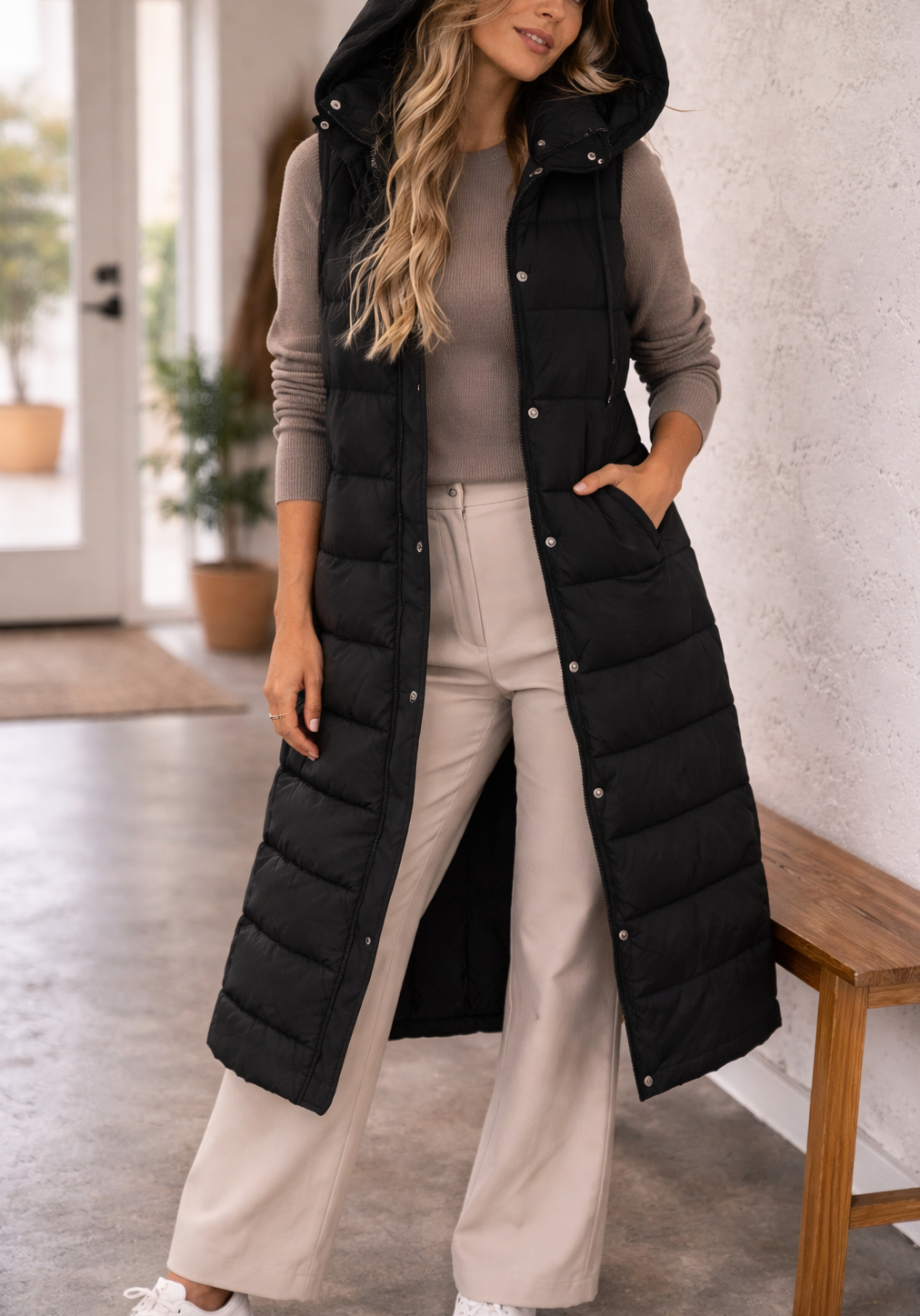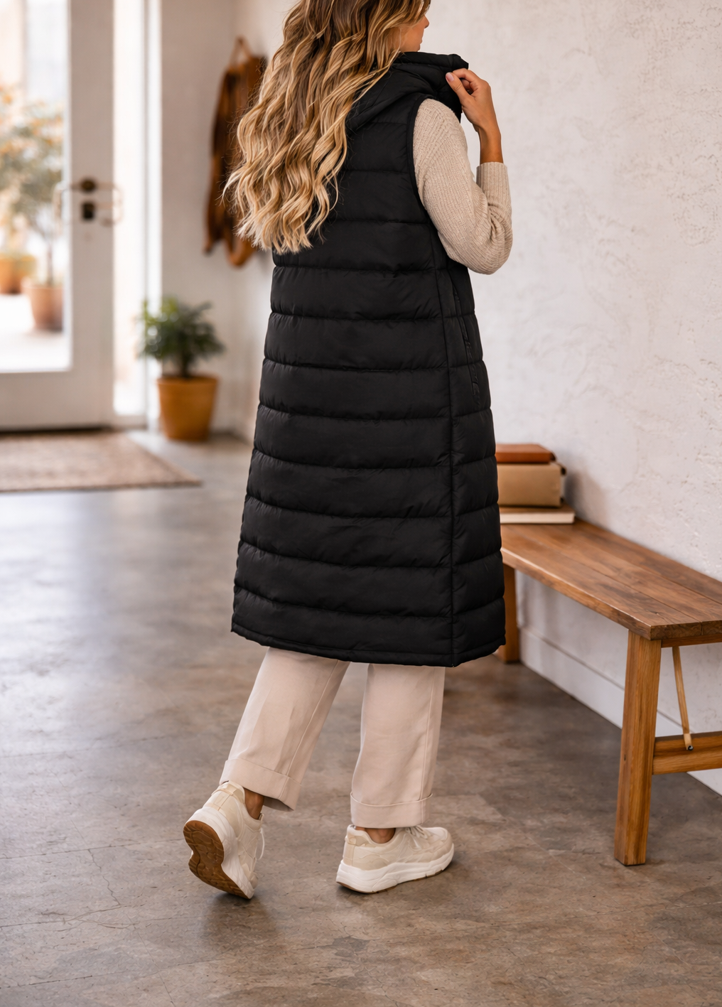 This long padded vest is perfect for keeping you warm on chilly days. With a high collar and practical button closure, it offers both comfort and style. The sleeveless design makes it ideal for layering, making it a great choice for everyday wear.