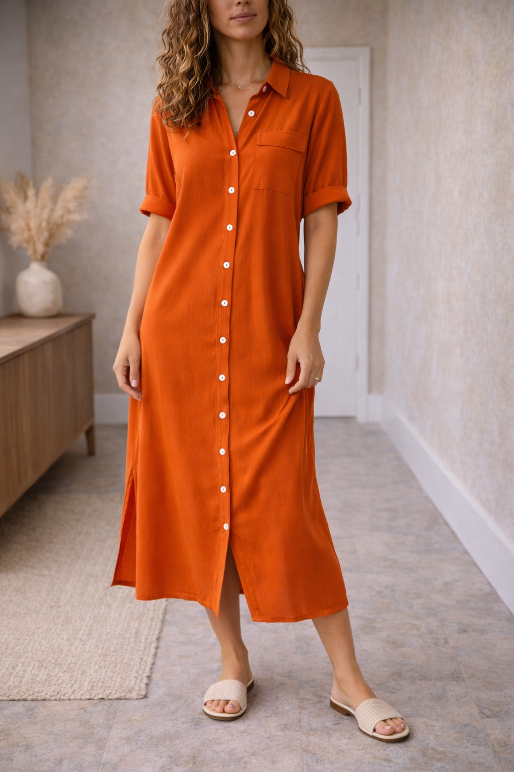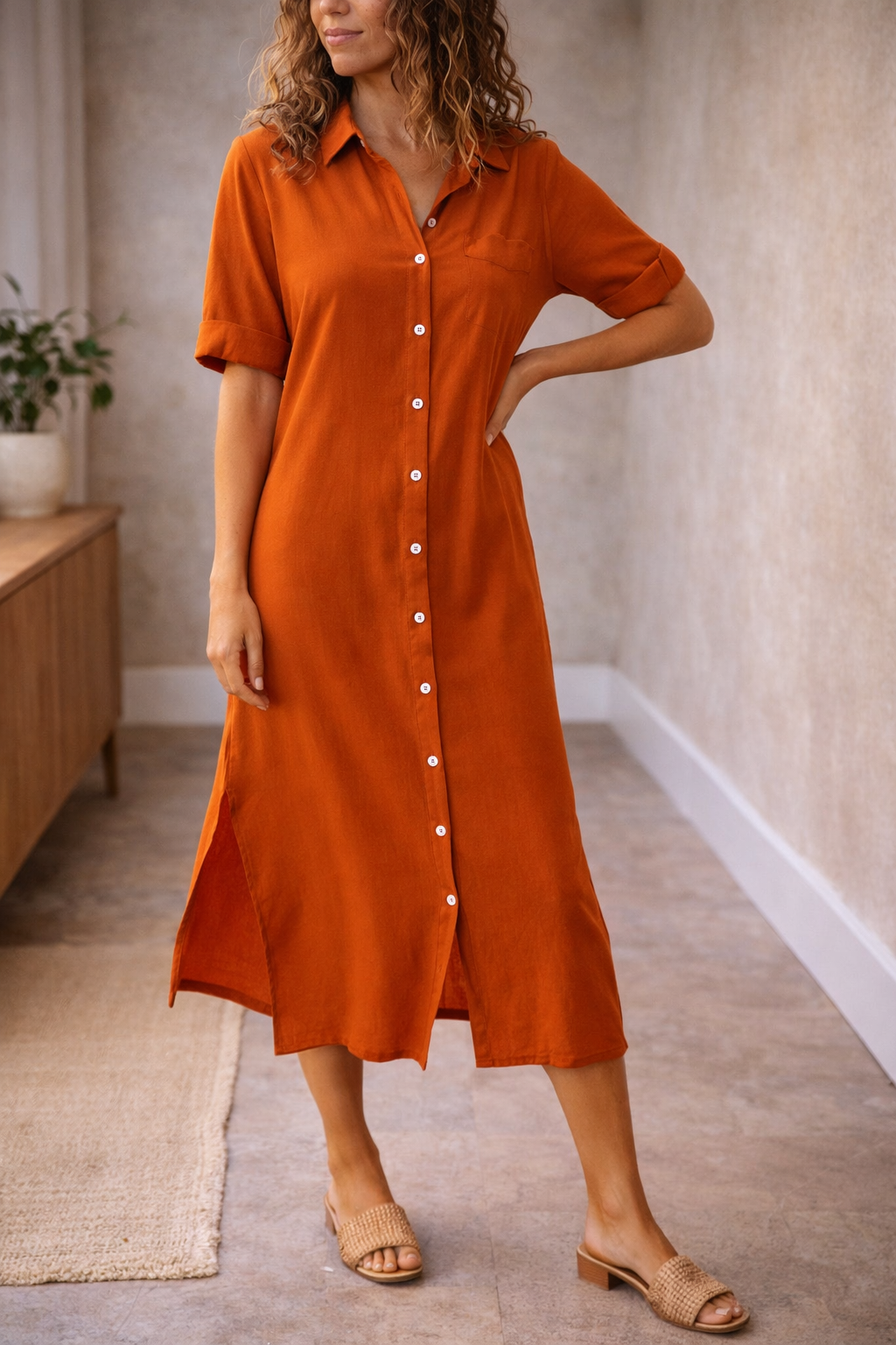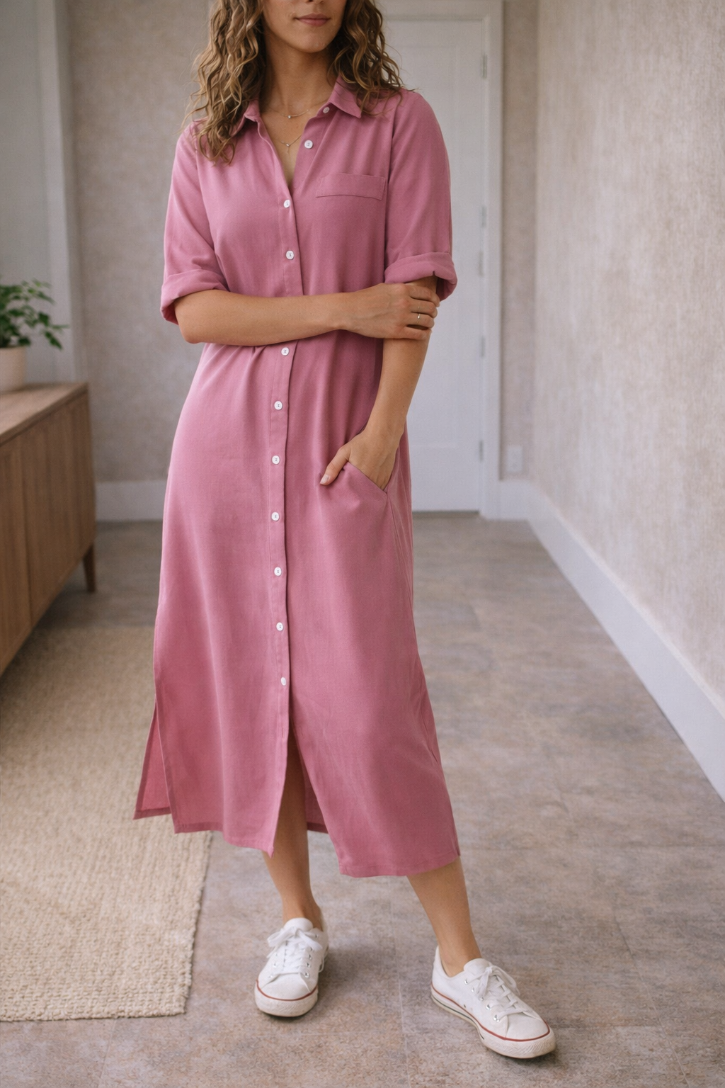 This button-front midi dress offers a timeless silhouette that's perfect for both casual and dressy occasions. The dress features a flirty midi hem and a matching belt that accentuates the waist for a flattering look. With three-quarter sleeves and a lightweight, breathable construction, it's both comfortable and stylish.